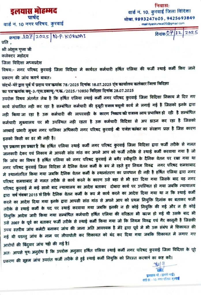 विदिशा / कुरवाई। नगर परिषद कुरवाई में एक कर्मचारी की कथित फर्जी स्थाई नियुक्ति को लेकर विवाद गहराता जा रहा है। वार्ड क्रमांक 10 से पार्षद इल्यास मोहम्मद ने इस संबंध में जिला कलेक्टर विदिशा को पत्र लिखकर पूरे मामले की उच्च स्तरीय जांच कराने और दोषी पाए जाने पर नियुक्ति निरस्त करने की मांग की है।